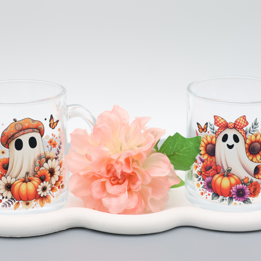 Glas Tasse mit niedlichem Herbst Geist mit Schleife| trendige Kaffeetasse mit frechen Motiven | 300ml Tasse für Büro