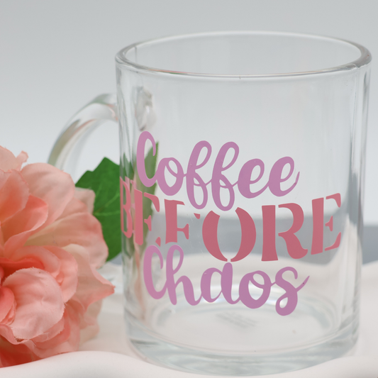 Coffee before Chaos 300ml Glas Tasse | trendige Kaffeetasse mit frechen Vinylmotiven |für heiße Getränke zuhause oder im Büro