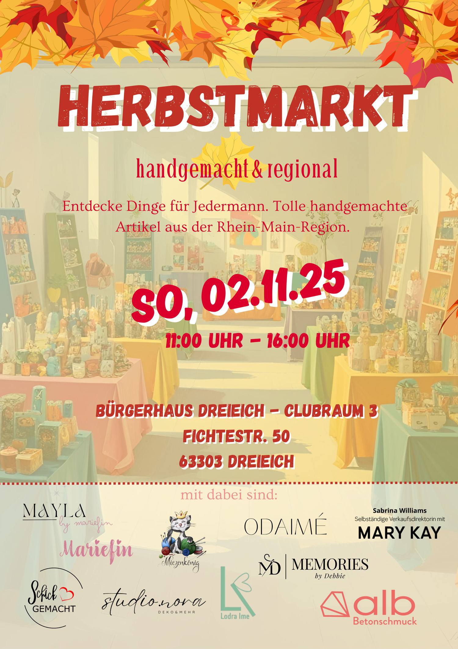 Am Sonntag, 02.11.25 freuen wir uns, euch zum ersten Herbstmarkt in Dreieich begrüßen zu dürfen.